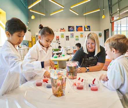 Right; STEAM teacher Jacquie Drey participates in an engaging acticity with students.