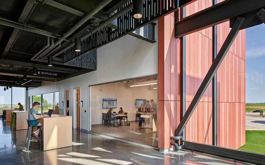 each wing have brought an exciting dimension to learning with the Storm Lake School District. Smith notes, “These different hands-on spaces did not exist anywhere in the school district before, so this is their first experience with these types of spaces.” This transformative addition to the school district has also created opportunities for the cross-pollination of ideas and subjects in a merged learning environment. Operable garage doors that exist as the wall between the STEAM lab and media center help foster these collaborative interactions. They also provide a means to showcase ongoing learning and creative projects, allowing students to observe and draw inspiration from their peers. The incorporation of these garage doors has also helped to reshape the way curriculum is delivered at the school. Smith explained how teachers will try