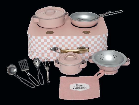 Classic and timeless kitchens, featuring a frying pan, pot, and three kitchen utensils. On the back, there’s a chalkboard to write today’s menu – chalk included. Perfect for little chefs to get creative!