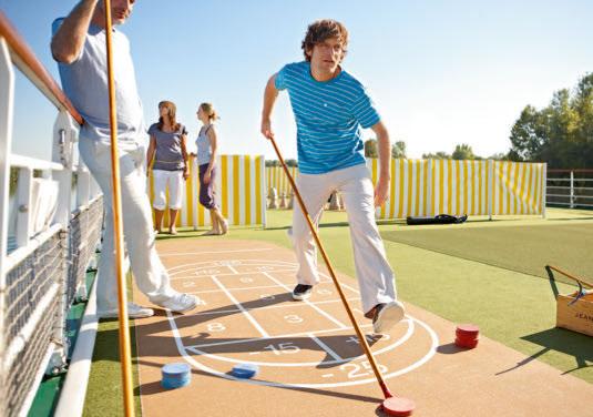 Auf unserem Sonnendeck ist viel Platz für himmlisch entspannte Momente. Mit einem kühlen Drink im Liegestuhl oder zur Abkühlung im Swimmingpool. Nach dem Abtrocknen bringt eine Partie Shuffleboard Spannung in den Tag. Mit der Familie oder mit neuen Freunden. Und später stoßen Sie gemeinsam auf den roséfarbenen Himmel an.