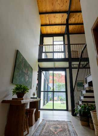 La casa, que ya había sido transformada años atrás en las oficinas de una empresa inmobiliaria local, tenía una estructura estable de muros portantes, pisos, cubiertas y cielos en madera que decidimos renovar y mantener.