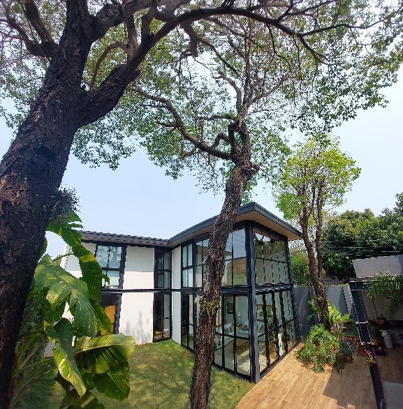 Desde las primeras fases del proyecto, se contempló la obtención de la certificación EDGE, una meta que se discutió en las reuniones iniciales con los arquitectos. La vivienda fue diseñada en forma de L, rodeando el patio central, lo que permite que la mayoría de los espacios cuenten con una iluminación natural óptima y una vista agradable hacia el área verde. Las ventanas que dan al patio son amplias, mientras que las que miran hacia la calle son más pequeñas, garantizando así la privacidad de los habitantes.