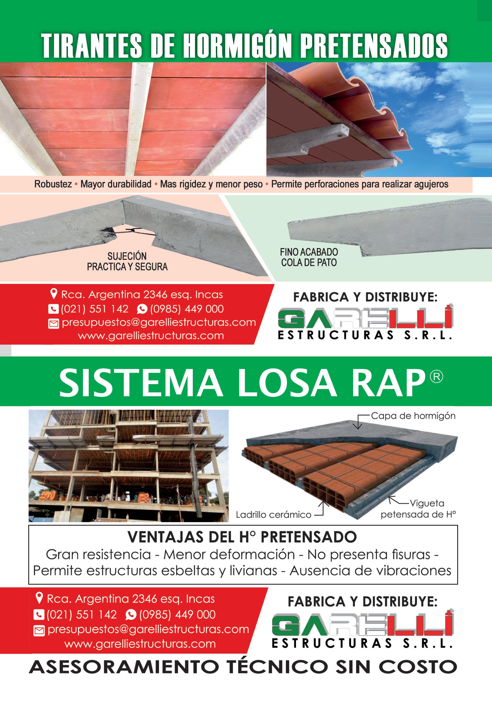 MANDU’ARA LABORATORIO DE ENSAYOS LOSA PREFABRICADA Vigueta de Hº pretensado y ladrillo (Losa Rap)Puesto en obra 01 De 0,50 a 4,80 m, m2 87.600 02 De 4,90 a 5,90 m, m2 95.600 03 De 6,00 a 7,60 m, m2 107.600 PreLosa pretensada y ladrillo Rap (PreRap 0,12x1,20 m) - Puesto en obra 01 Largo hasta 5,2 m m2 105.000 02 Largo hasta 6,1 m m2 110.000 03 Largo hasta 6,8 m m2 116.000 04 Largo hasta 7,7 m m2 126.000 05 Largo hasta 9,5 m m2 235.000 Vigueta de cerámica armada con cielo raso de hormigón visto incluido, a retirar de fábrica. (Listalosa) Ancho = 20 cm / Altura = 10 cm m2 122.000 MÁRMOL Y GRANITO Granito natural Espesor 2 cm 01 Gris Corumba m2 550.000 02 Verde Ubatuba m2 640.000 Revista Mandu’a - 95