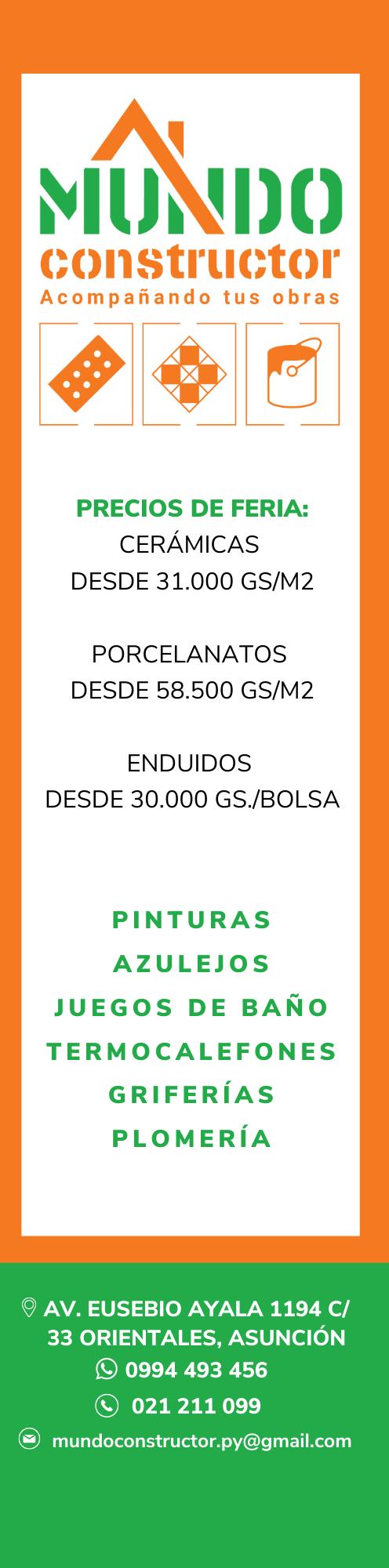 MANDU’ARA MAMPARAS 01 Mampara ciega m2 130.000 02 Mampara vidriada m2 145.000 03 Accesorios y herrajes p/ puerta simple, un 280.000 TEL.: 021 906 951 CEL.: 0971 543 246 CDE: 061 570 501 MALLA ELECTRO SOLDADA Garelli 1 De diámetro 4,2 mm, para cubrir 15 m2 un 120.000 MALLA DE FIBRA DE VIDRIO CASARINO - Para refuerzo de revoques, de 50 m 1 De 5x5 x 75 gr, un 364.000 2 De 5x5 x 110 gr, un 416.000 3 De 5x5 x 145 gr, un 468.000 4 De 10x10 x 110 gr, un 416.000 5 Tela tramada p/refuerzo de pinturas y cementicios 1 x 100 m2 un 946.500