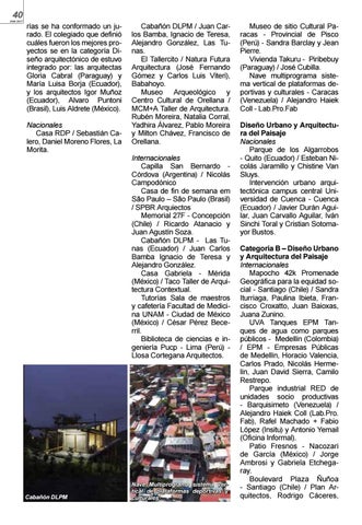 Cabañón DLPM / Juan Carlos Bamba, Ignacio de Teresa, Alejandro González, Las Tunas. El Tallercito / Natura Futura Arquitectura (José Fernando Gómez y Carlos Luis Viteri), Babahoyo. Museo Arqueológico y Centro Cultural de Orellana / MCM+A Taller de Arquitectura. Rubén Moreira, Natalia Corral, Yadhira Álvarez, Pablo Moreira y Milton Chávez, Francisco de Orellana. Internacionales Capilla San Bernardo Córdova (Argentina) / Nicolás Campodónico Casa de fin de semana em São Paulo – São Paulo (Brasil) / SPBR Arquiectos Memorial 27F - Concepción (Chile) / Ricardo Atanacio y Juan Agustín Soza. Cabañón DLPM - Las Tunas (Ecuador) / Juan Carlos Bamba Ignacio de Teresa y Alejandro González. Casa Gabriela - Mérida (México) / Taco Taller de Arquitectura Contextual. Tutorías Sala de maestros y cafetería Facultad de Medicina UNAM - Ciudad de México (México) / César Pérez Becerril. Biblioteca de ciencias e ingeniería Pucp - Lima (Perú) Llosa Cortegana Arquitectos.