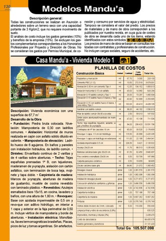 Modelos Mandu’a Descripción general: Todas las construcciones se realizan en Asunción o alrededores sobre un terreno seco con una capacidad portante de 3 Kg/cm2, que no requiere movimiento de suelo. El análisis de costo incluye los gastos generales (10%) y beneficio de la empresa (15%). Se excluyen los gastos complementarios correspondientes a los Honorarios Profesionales por Proyecto y Dirección de Obras. No se consideran los gastos por Permiso Municipal, de co-