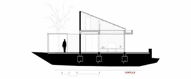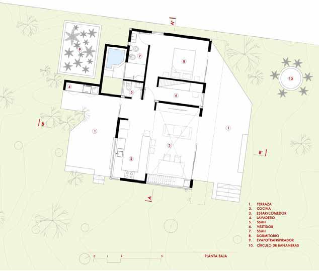 Las terrazas exteriores se diseñaron como un basamento que construye sus formas según la cercanía a los árboles, desviando el agua pluvial y creando espacios complementarios a los interiores. Este basamento no solo actúa como una extensión de los espacios habitables, sino que también facilita una transición fluida entre el interior y el exterior, permitiendo que la casa se perciba como un gran espacio intermedio en continua interacción con la vegetación circundante.