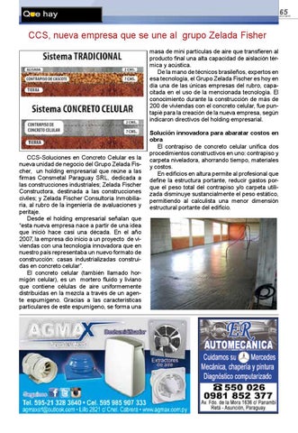 CCS-Soluciones en Concreto Celular es la nueva unidad de negocio del Grupo Zelada Fischer, un holding empresarial que reúne a las firmas Consmetal Paraguay SRL, dedicada a las construcciones industriales; Zelada Fischer Constructora, destinada a las construcciones civiles; y Zelada Fischer Consultoría Inmobiliaria, al rubro de la ingeniería de avaluaciones y peritaje. Desde el holding empresarial señalan que “esta nueva empresa nace a partir de una idea que inició hace casi una década. En el año 2007, la empresa dio inicio a un proyecto de viviendas con una tecnología innovadora que en nuestro país representaba un nuevo formato de construcción: casas industrializadas construidas en concreto celular”. El concreto celular (también llamado hormigón celular), es un mortero fluido y liviano que contiene células de aire uniformemente distribuidas en la mezcla a través de un agente espumígeno. Gracias a las características particulares de este espumígeno, se forma una