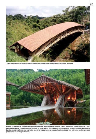 Puente Guanezhoua, ubicado en la reserva natural montañosa de Nankun, China. Realizado como acceso al Crosswaters Ecolodge, cruza un pequeño río de 38 m de ancho. Es una estructura tipo mixta, ya que combina hormigón y bambú, conformada por una gran viga que da forma a un arco apoyado directamente por sus extremos en dos grandes pedestales de hormigón armado.