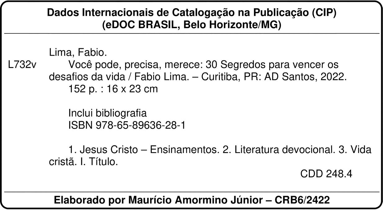 Fabio Lima fez este livro como quem constrói uma porta a fim de nos fazer entrar num mundo de esclarecimento que nos levará a conhecer quem de fato somos diante do Senhor e para nós mesmos, pessoas criadas para serem mais do que vencedoras, ou seja, aptas para avançarem os próprios limites, e isso significa caminhar sem medo de alçar os mais altos voos.