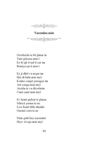 z Gewherên te bê jimar in Yarê gilyaza min î Ez bi qîr û nal û zar im Roniya çavê min î Ez ji dûrî va neçar im Her di bala min tuyî Ketme cengê şoreşger im Arê cenga min tuyî Ayetên te va dixwînim Canê canê min tuyî Ev hemî gulzar û çîmen Miriyê şerma te ne Lew hemî tîtik dinalin Gazinê zora te ne Dêm gulê hey nazenînê Heyv û roja min tuyî 94