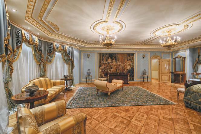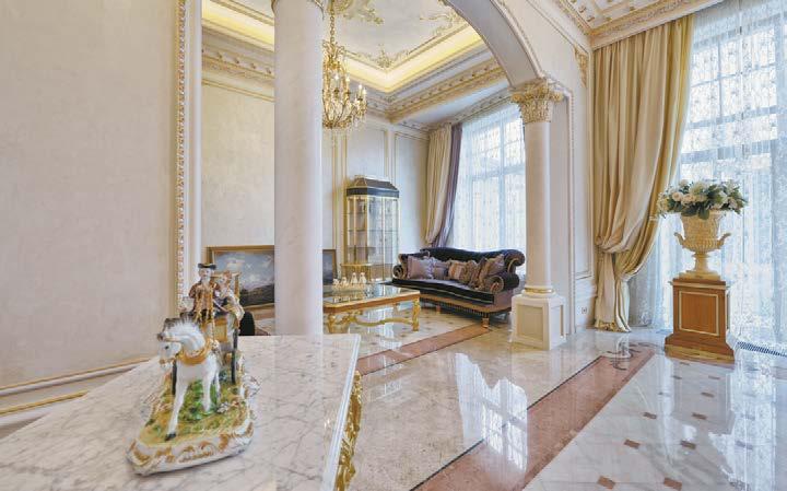цього стилю відрізняються легкістю, висо чиною і мінімалізмом. Як правило, під час оформлення приміщення в цьому стилі ви користовують велику кількість кераміки, фресок та статуй. Для античного інтер’єру характерні грецькі візерунки й орнаменти, різноманітні геометричні елементи. Загальне кольорове оформлення найчастіше ґрунтуєть ся на двох контрастних відтінках, наприклад чорний і білий або коричневий і бежевий. Для декорування та оздоблення в античному стилі використовують білі, золотисті і тера котові кольори (мал. 6). Бароко (від італ. barocco — дивний, ви гадливий) — стиль, що зародився в Італії на межі XVII і XVIII століть. Його «батьком» вважають великого скульптора й живописця Мікеланджело. Саме він першим зрозумів, як можна застосувати пластику стіни для ство рення елементів, що підкреслюють стиль. Цьому стилю властиві пишність і урочистість (мал. 7). Характерною ознакою бароко є про сторові ілюзії, фрески на стелях, золотий або срібний розпис, гобеленові шпалери, коштов ний текстиль, картини в масивних рамах, Мал. 7. Інтер’єр у стилі бароко