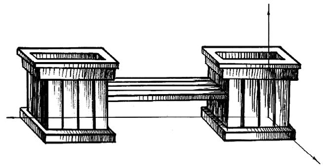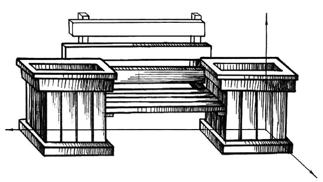 Визначившись із остаточним варіантом, здійснимо аналіз геометричної форми виро бу за його наочним зображенням (мал. 54). Виріб подумки розчленовуємо на прості гео метричні тіла (деталі), називаємо їх і розповідаємо, як вони розташовані одна відносно іншої у просторі. Отже, наш виріб складатиметься з трьох основних частин: двох бокових тумб для квітника і сидіння, яке буде розміщено між тумбами та кріпитися до боків тумб. Тумби мають форму правильної чотирикутної при