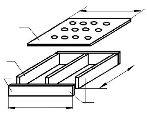 зми із внутрішньою порожниною. Основою тумб є квадрат, сформований із двох поздо вжніх та трьох поперечних брусків у формі прямокутних паралелепіпедів, до нього до єднується дно квадратної форми. Між тумбами за допомогою болтового з’єднання кріпиться решітка у формі прямокутного паралелепіпеда, поздовжні сторони якої з’єднані між собою ребрами жорсткості для забезпечення стійкості кріплення. Решіт ка є основою сидіння. У внутрішню порож нину тумби монтується кошик для рослин у формі чотирикутної призми або чотири кутної зрізаної піраміди.