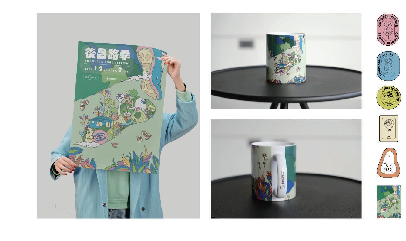 主視覺以走路做為主要的設計框架,加上高雄後昌路的 許多在地元素,結合成一動感的形象。透過走讀,認識 後昌路,透過搜集作品,進入到街區裡面。