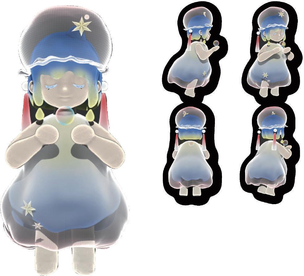 將水母的透明裙襬作為主要元素展現,並加入一些 星星、泡泡等夢幻元素,想呈現出輕盈與夢幻感。