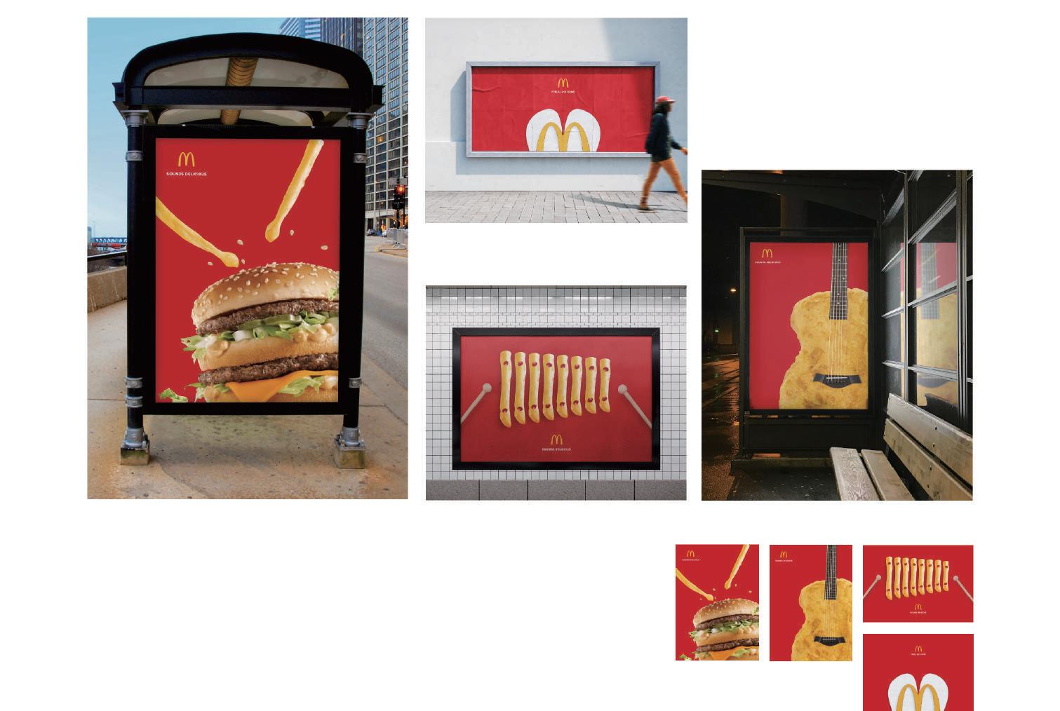 以”聽起來好好吃”與”像在家一樣”為宣傳標語,結合 不同樂器實際展現“聽”的具象效果;拖鞋結合M呈現 在家的舒適感。