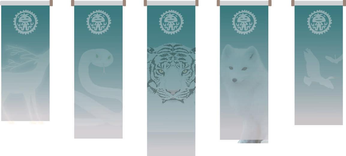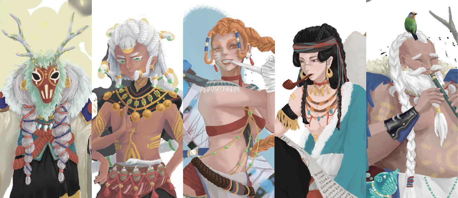 上所常出現的工具與元素創作;最後一張則是 以“於群山層疊中尋找未來”為概念設計。