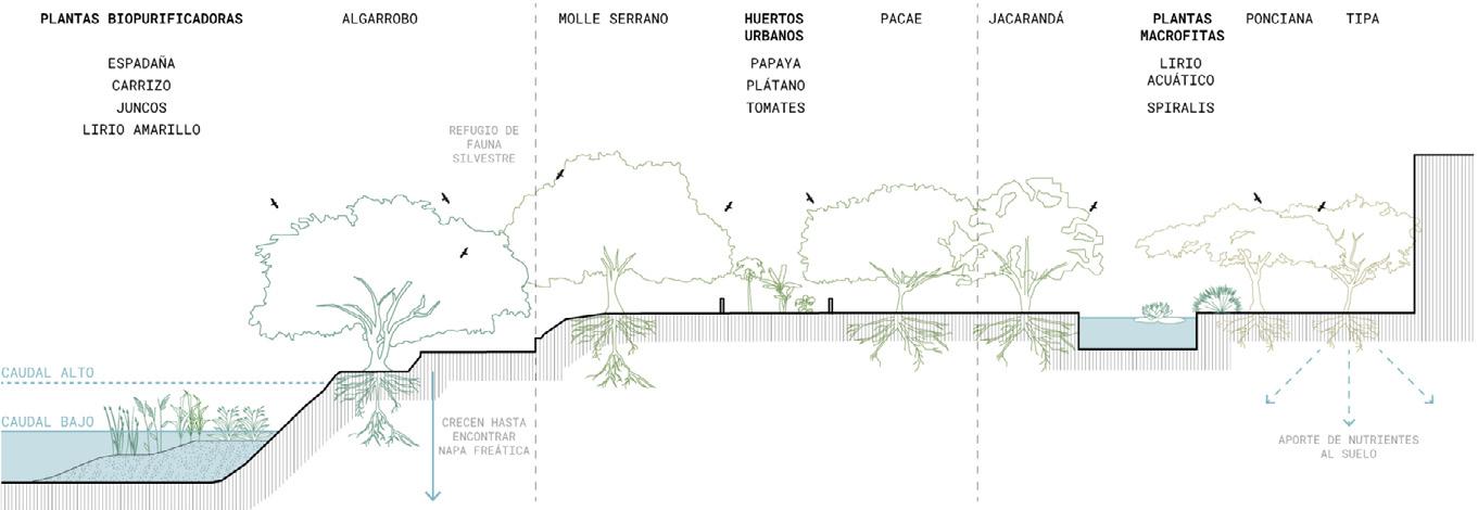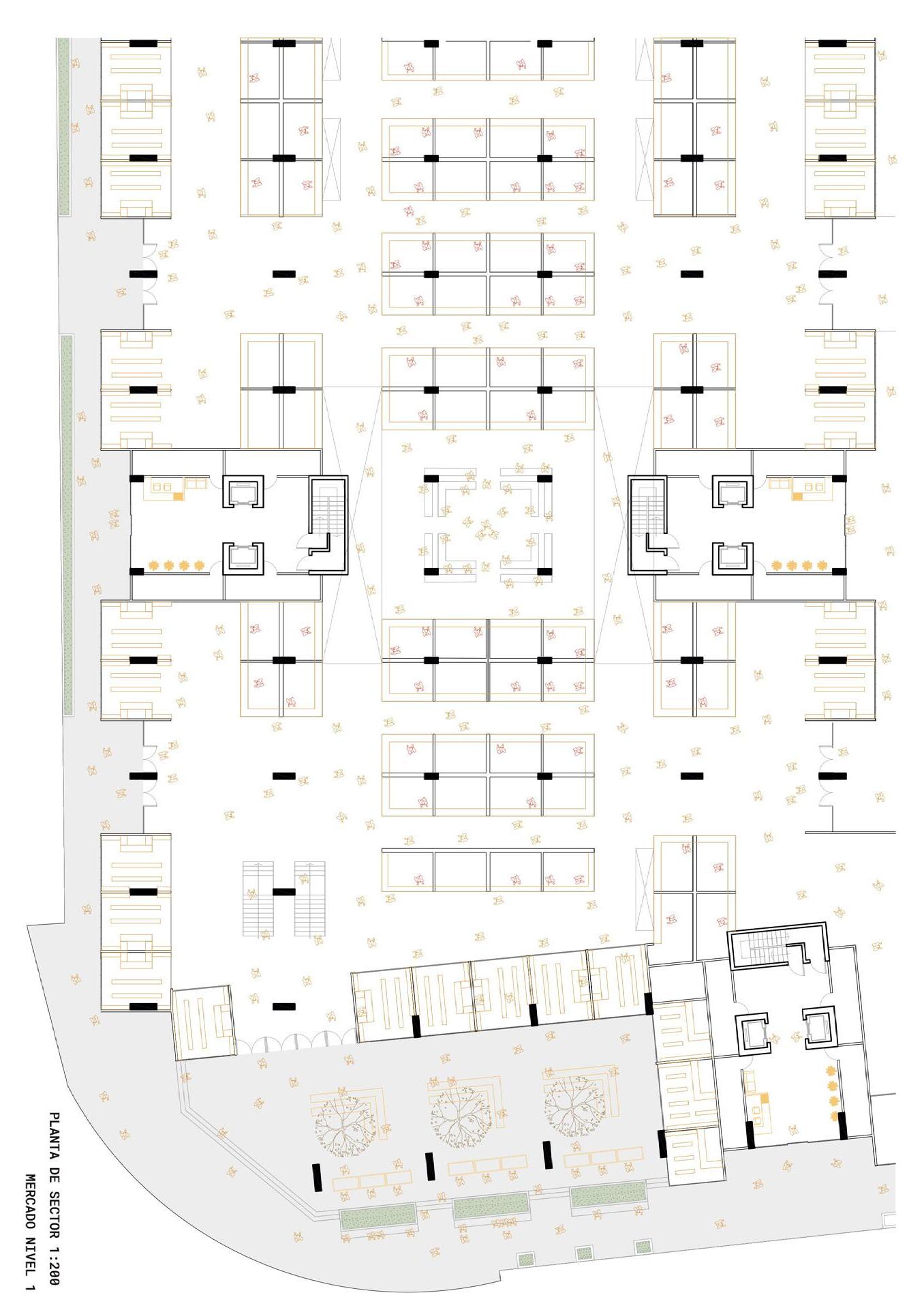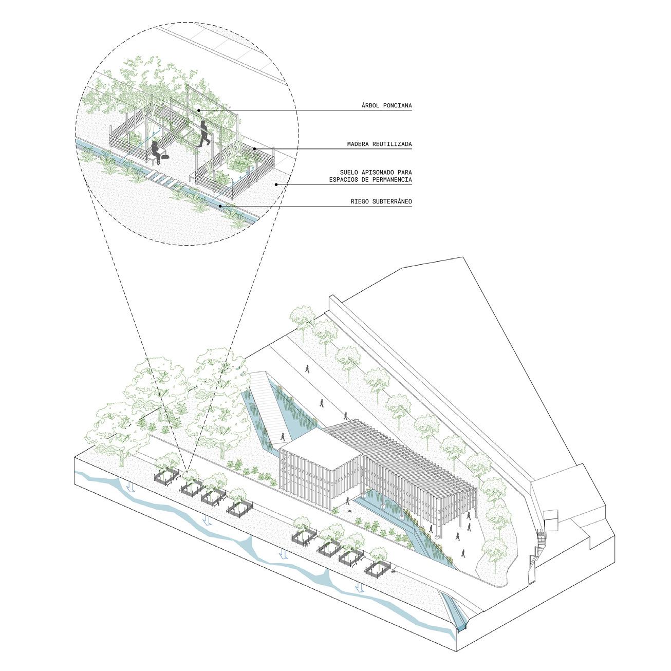 El proyecto conecta a los barrios existentes de Callao con las nuevas transformaciones urbanas que potenciarán a este cruce como una nueva centralidad. Las barras de viviendas presentan un escalonamiento para conversar con la escala de las viviendas del entorno. La distribución de espacios privados y públicos responde a las dinámicas urbanas de la zona de viviendas y parques como centro de la comunidad. Por un lado, el zócalo conformado por el mercado Trabajadores unidos y el Centro deportivo cultural, suturados por la serie de parques, canchas deportivas, alameda interior y plaza principal, responden a las escalas vecinal, zonal y metropolitana que se fusionan en el proyecto. En su interior, el proyecto busca aprovechar y potenciar el habitar de los vecinos/trabjadores como comunidad. Los espacios que lo posibilitan (zonas de estudio, lavanderías, huertos, zonas de pa- rrillas) se plantean a partir de las actividades identificadas en los barrios actuales de Callao.