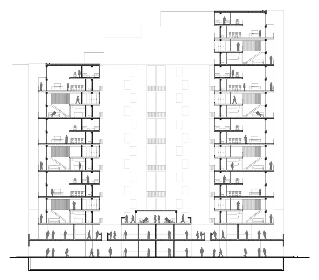 Sistema híbrido de vivienda, comercio y barrio en altura Taller 7
