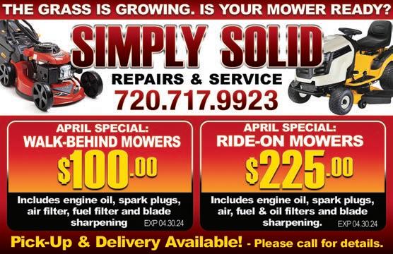 O ered by: Colorado Karate Club Potential Is Nothing… Until You Do Something! Mowing • Aeration • Rototilling • Weed Removal Yard Clean-Up - Weeds, Leaves, Tall Grasses & Tree Branches Shrub Planting • New Mulch • Small Rock Jobs Sprinkler Systems: • Turn-On • Repair & Installation Established 2002 - Fully Insured COMMERCIAL | RESIDENTIAL | REALTOR PROPERTIES Find Us On Facebook Landscaping Pros Co Quality Work At Reasonable Rates! 303-523-7833 Yard Clean-Up Sprinkler Repair Spring Aeration We offer all natural, premium steakhouse quality beef, pasture raised with no hormones, steroids, or antibiotics. AVAILABLE GRASS OR CORN FINISHED WHOLE | HALF | QUARTER or SMALLER BUNDLES 303.968.9775 29100 E. 152nd Ave, Brighton, CO 80603 All Natural Premium Colorado Steak House Quality Beef At Affordable Prices A 5th generation family caring for land and cattle in Colorado since 1916. SHOP ONLINE AT: www.uelegacybeef.com THANK YOU for the best beef in town! We so appreciate your beef and your service. Many Blessings… — Carl R. Beef!