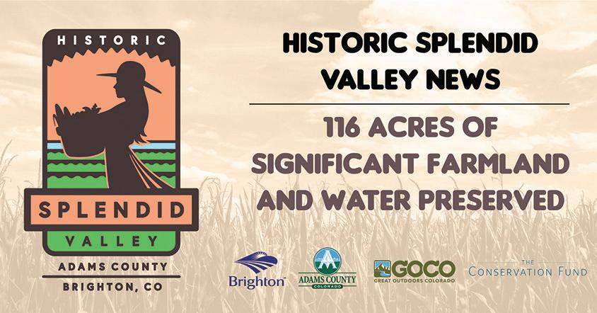 TheCity of Brighton and Adams County, with the expertise of The Conservation Fund, have successfully preserved the 116-acre Wagner-Mayhew Farm and its related 115 shares of senior water rights. The farm is located in Historic Splendid Valley, the vibrant agricultural area south of Brighton and within the Greater Denver Metropolitan area. This partnership, along with significant grants from the Adams County Open Space Sales Tax program and Great Outdoors Colorado (GOCO), have enabled Brighton to purchase the Wagner-Mayhew farm, with a conservation easement held by Adams County placed on this property, allowing farming to continue while ensuring the land will not be subdivided or developed.