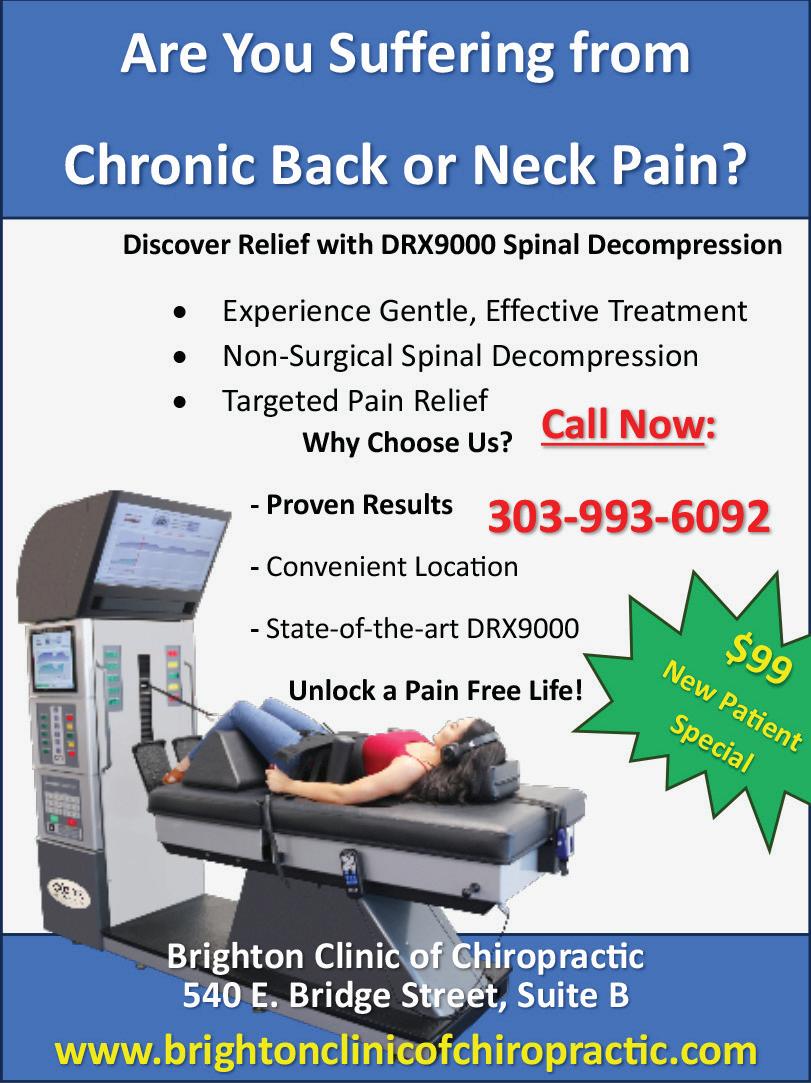 Offered by: Brighton Clinic of Chiropractic 1575 E. Bridge St. • Brighton (In the Safeway Shopping Center) www.Brightonchiro.com 303.655.9400 Dr. Larry Chrisman Chiropractor and Nationally Certified Decompression Doctor Back in Balance CHIROPRACTIC Massage & Acupuncture Degenerative Disc Disease Sciatica Failed Back Surgery Difficulty Walking Numbness to Extremities Disc Bulges Herniated Discs Pain For Over 10 years Initial Exam, Consultation, Doctor’s Report of Findings, & First Adjustment ONLY: *When you mention this ad. Some restrictions apply. MAY SPECIAL: $25 WE OFFER Spinal Decompression Therapy The latest in Non-Surgical Back Pain Treatment Cleared by The FDA Are you suffering from: • Muscle Pain? • Headaches? • Car Accident? • Neck Pain? • Back Pain? • Foot Pain? Bring activity back into your life at Over 20 Years Experience Provider For Many Insurance Networks