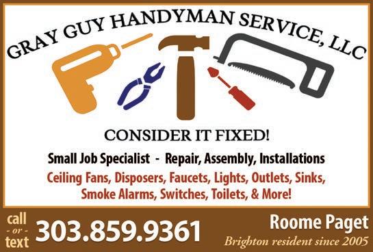 The Brighton Buzz | October 2022 25Bee a part of The Buzz next month! To advertise, call: 303.404.2000 Valuable Resources 50% off Diagnostic Rate after completion of repairs (regularly $100) Offer EXP 10.31.22 20+ years of experience in construction and repairs www.prometheanimprovements.com General Contractor/Handyman specializing in repairs Follow Us • Bonded, licensed and insured • Home and appliance repair Free appliance haul away with install of new • Remodels and renovation • Residential and Commercial Call For A Quote Today! 720-383-7608 Well Rounded Repair Solutions Not sure which are the owers and which are the weeds? Do you love having owers but don’t have time to plant them? We can cut back your bushes, pull the weeds, start preparing new gardens and installing new perennials for next season, refreshing your landscape to look clean and new! Call Kristi at Gardening Angels Today! 720.951.4515No Contracts! Call for A Free Consultation! 203 Telluride Street | Suite 400 | Brighton, CO | 80601 303.500.7706 www.TolisonWilliamsLaw.com • Child Support • Divorce • Post Decree Modifications • Family Law • Trusts & Estates • Probate • Elder Law • Child Custody • Adoption Serving Clients in the Areas of: Proudly Serving: Weld • Larimer • Boulder • Adams Jefferson • Broomfield & Denver Counties
