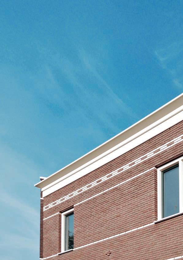 Voorgevel met heldere baksteenvolumes, borstweringselementen en reliëfstenen