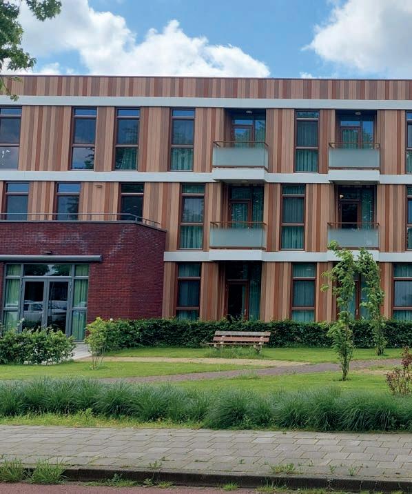 Bij het woonzorggebouw aan het Hollandsch Diep staat het contact met buitenruimte en natuur centraal. Het gebouw huisvest zorgwoningen voor mensen met een verstandelijke beperking, waarbij de planning van ruimten voor dagbesteding en fysiotherapie de bewoners optimale ondersteuning biedt. De aangrenzende buitenruimte is openbaar toegankelijk en zorgvuldig ingericht met lage beplanting, waardoor het parkachtige karakter behouden blijft en een groene overgang naar de omgeving ontstaat. Deze buitenruimte fungeert als verlengstuk van de woningen, stimuleert ontmoeting en actieve bezigheden en draagt bij aan welzijn en ontspanning van de bewoners. Door het combineren van functionele zorgvoorzieningen met een aangenaam, groen verblijfsklimaat ontstaat een woonzorgomgeving waarin zowel zorgkwaliteit als leefkwaliteit hand in hand gaan.