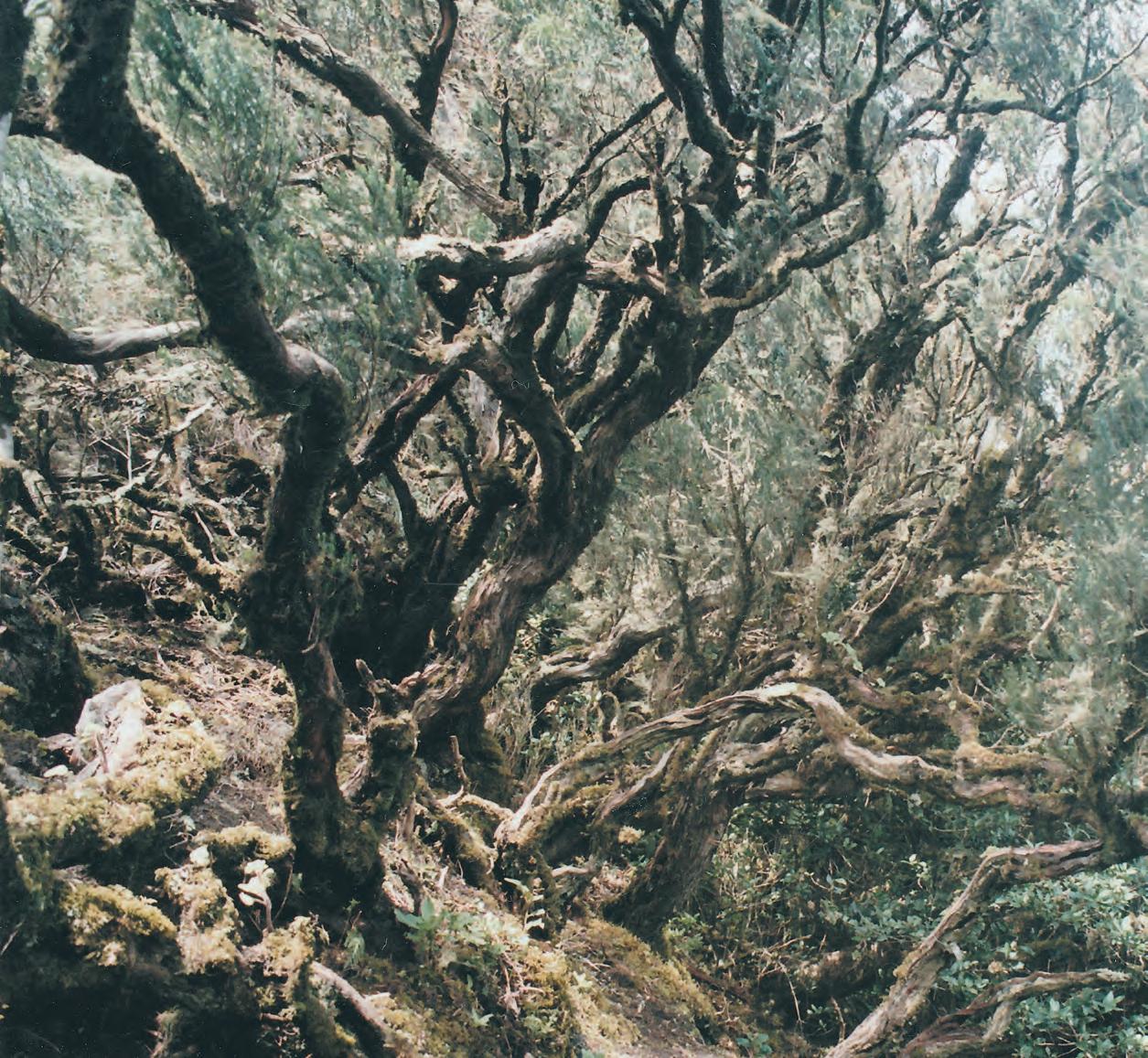 De donkergekleurde vulkanische grond is hier krachtig en sterk, neemt heldere, schone kosmische energie op, transformeert die en geeft een lichtvoetige en dragende energie terug. De continue frisse en sprankelende noordoostpassaat jaagt, rolt en danst ieder moment met nieuwe nevelwolken voorbij. Hiertussen en hiermee samenlevend staan de bomen al miljoenen jaren. Met hun kruin in de wind, de nevel omarmend, met hun wortels innig verbonden met de donkere aarde. Een groot vloeiend geheel van energie opnemend, transformerend en weer doorgevend.