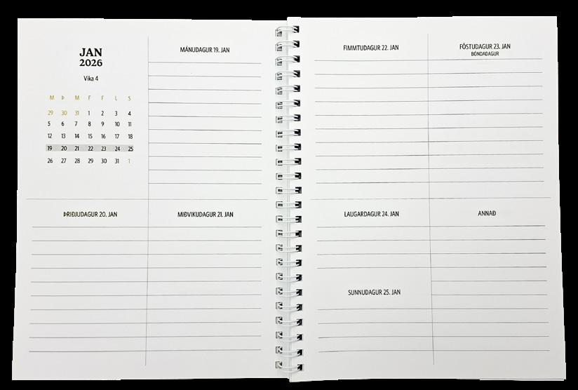 Stílhrein gormadagbók fyrir árið 2026, með gormum og viku á opnu. Yfirlitsdaga tal áranna 2025 og 2026. Þriggja mánaða dagatal vinstra megin á hverri opnu.
