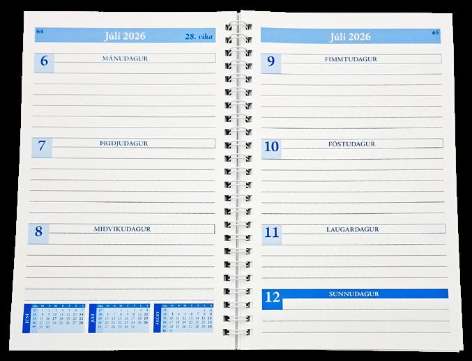 Falleg, vönduð og stílhrein dagbók með gormi fyrir árið 2026. Ein vika á hverri opnu, mánudagur til sunnudags, með dagsetningum. Íslenskir hátíðisdagar og frídagar eru merktir inn. Fremst í bókinni er yfirlit yfir hvern mánuð og aftast eru línustrikaðar síður þar sem hægt er að skrifa minnispunkta. Dagbókin kemur í tveimur litum, grænbláum og ferskju, í stærð 16 x 21 cm og með blómamynstri í stærð 12,8 x 18 cm.
