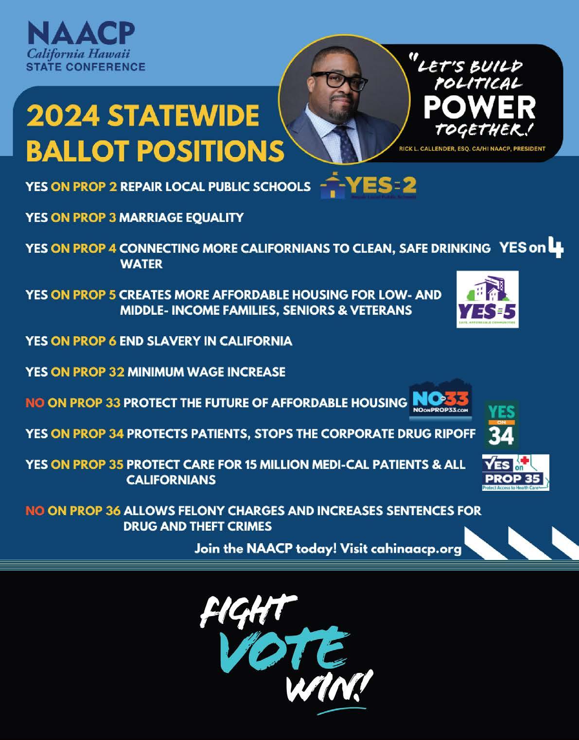 On behalf of the NAACP California-Hawaii State Conference, it is my pleasure to welcome you to the 37th Annual NAACP State Convention Each and every NAACP member makes a difference in the complex, ongoing work of advancing racial equity We have driven the hardest-fought wins for civil rights and social justice and with you by our side, we can accelerate the next milestones for Black Americans We have to be “All In” on voting rights, women's right to choose, affordable housing and health care, climate justice, and for all policy priorities the NAACP continues to fight for, in 2025 and beyond