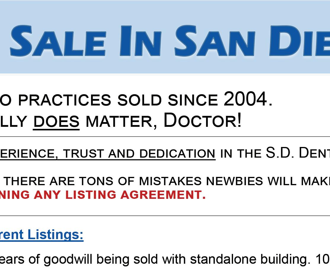 SANTEE: 4 ops. 32 years of goodwill. Located in busy strip mall. Strong and loyal patient base. Practice has room for growth with procedures being added. Very reasonable overhead.