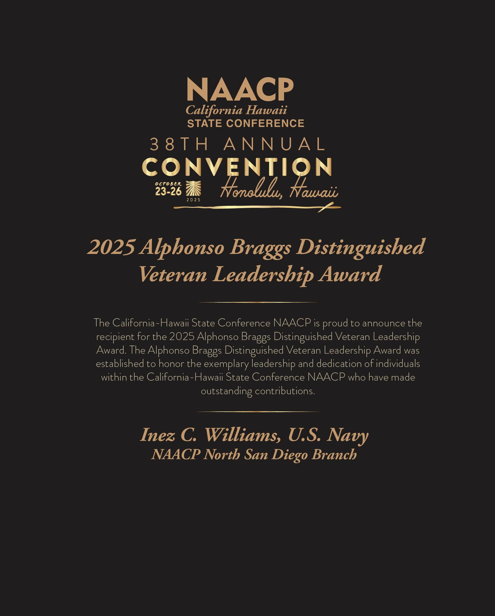 It is in true NAACP spirit that we continue to advance the mission and policies that define our legacy and stand together in faith, courage, and perseverance. I am honored to serve as your NAACP CA/HI State/Area Conference President and deeply grateful for your partnership and the aloha spirit that you bring to our collective work.