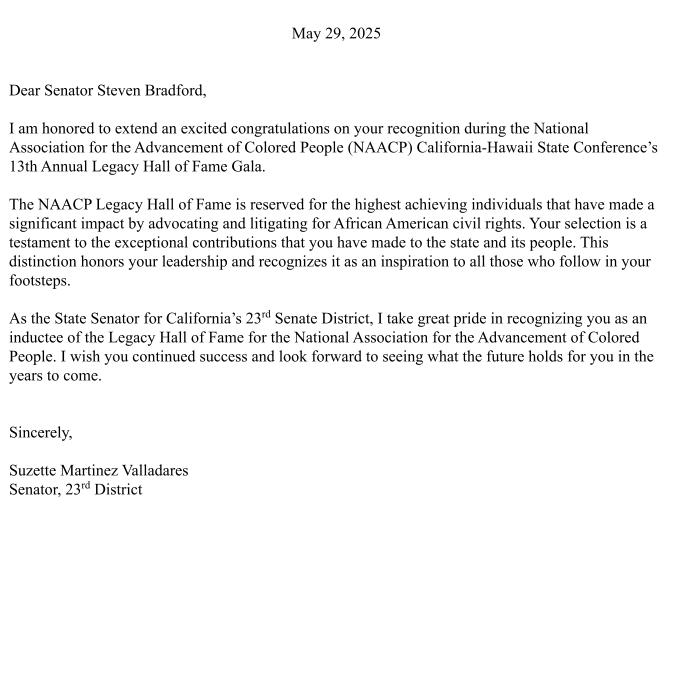 I also honor and recognize the outstanding accomplishments of this year's Legacy Hall of Fame inductees, my esteemed colleagues and dear friends, Secretary of State Dr. Shirley N. Weber and former State Senator Steven Bradford . They deserve this recognition for their relentless legislative efforts and community advocacy to champion civil rights and foster improvement and well-being in diverse communities across California.