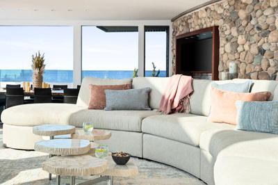 Due to the amount of windows in the space, all of the fabrics selected will withstand heavy UV. Fabric and rug selections are all indoor/outdoor rated.
