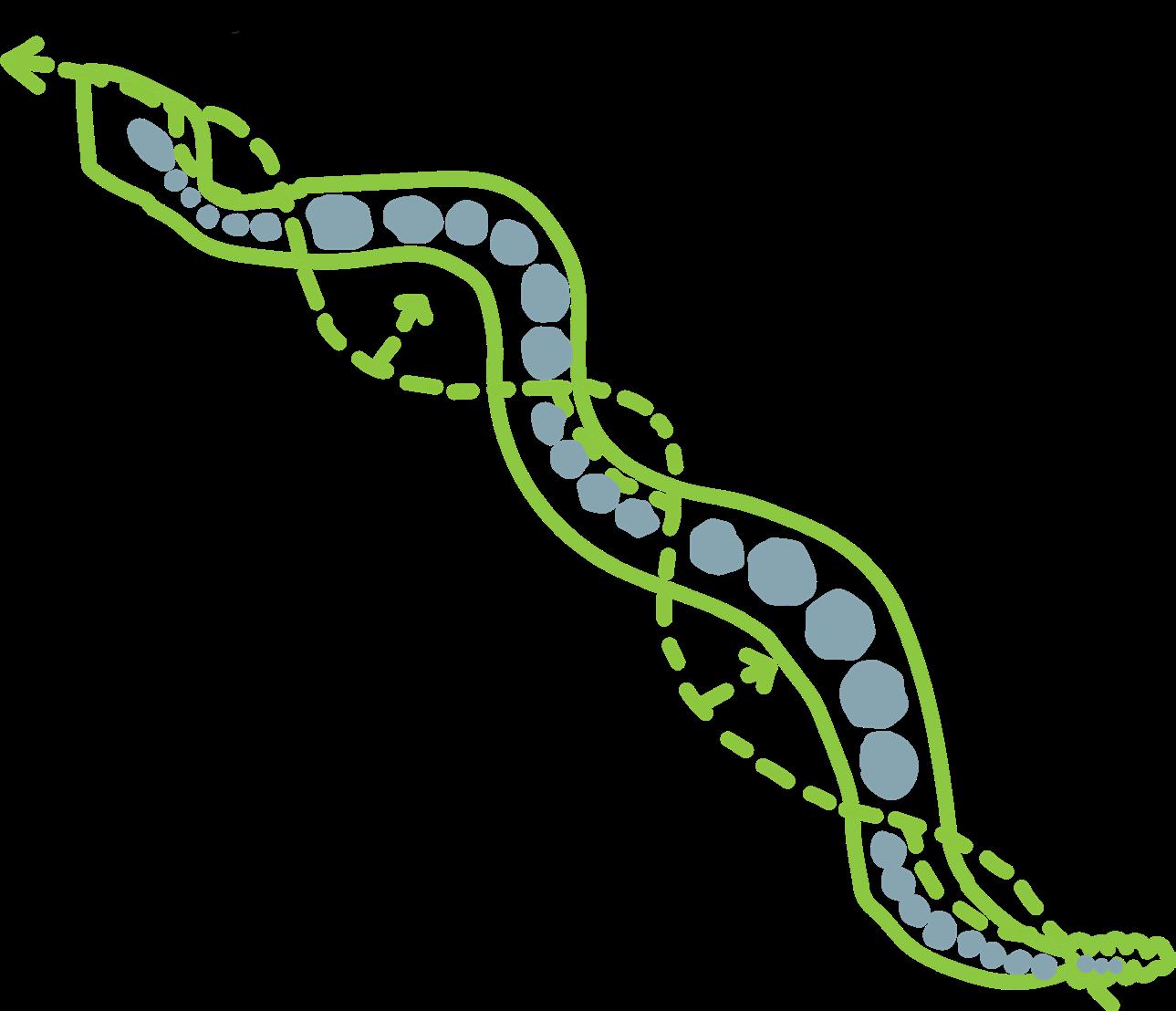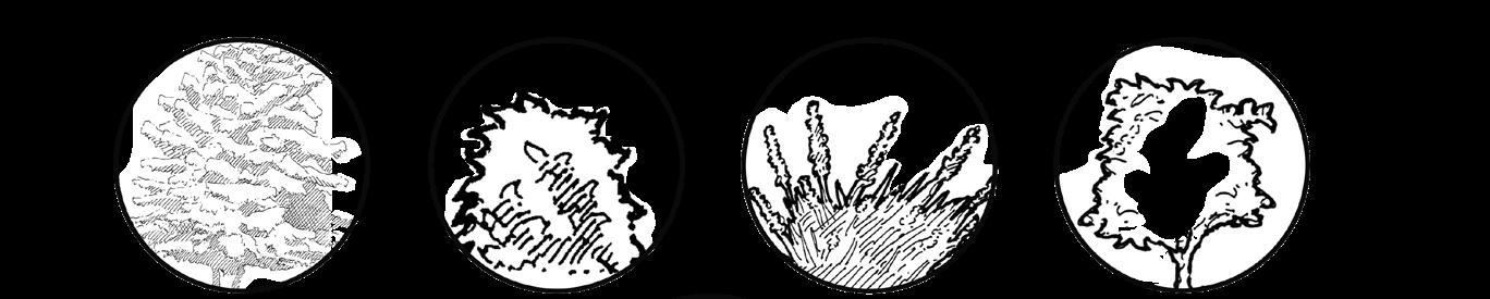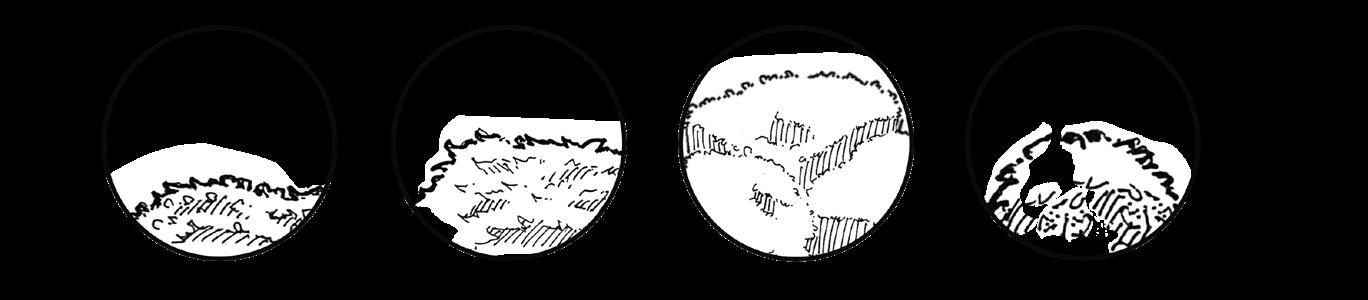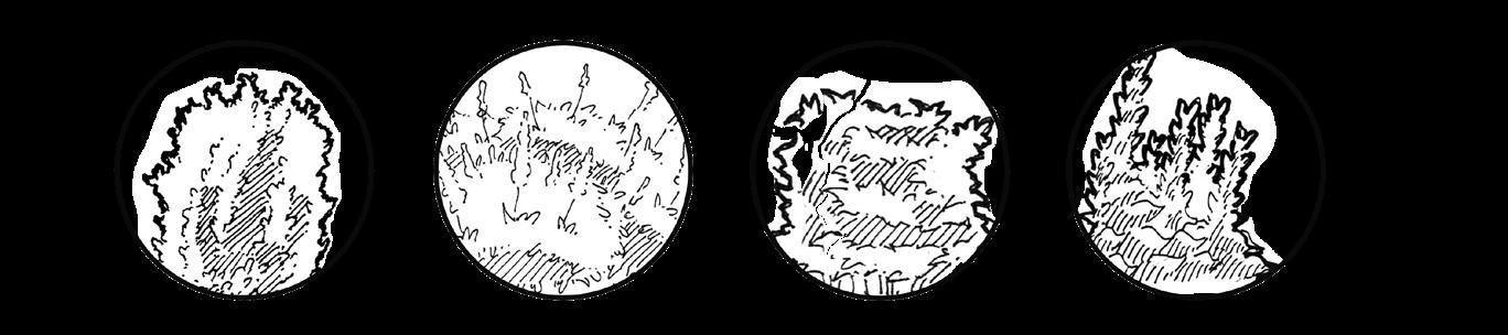 In my conceptual drawings I use color as the leading indicator for atmosphere. Below are examples of using brighter colors to indicate a warmer, people led experience. On the right are two examples where people are not meant to be present as is part of the intended experience. Comparing those two with the one on the bottom left with the snake head using hot over cold colors to suggest a more complex people and nature relationship in this space.
