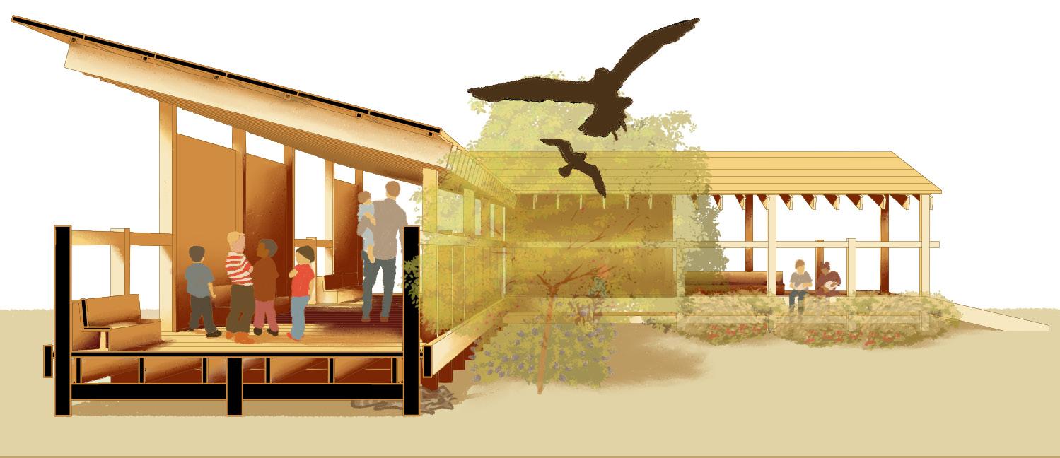 I also thought that the rattlesnake motif could have been further emphasized and since we had no budget, I used these large boulders to define small spaces for recreation but the boulders were all segments of a huge snake and the “aha” moment would be when they reach the end of the trail and see the giant snake head. Below is the conceptual art done for the programming.