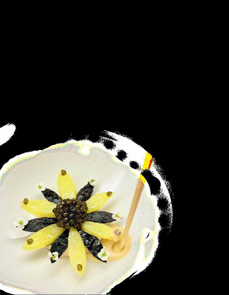 Present the kipper by pressing it into a ring cutter in a bowl, top with thinly sliced potatoes cooked in smoked butter and crispy nori. Place a lid over the bowl and smoke the dish before revealing at the table and pouring the sauce over the top.