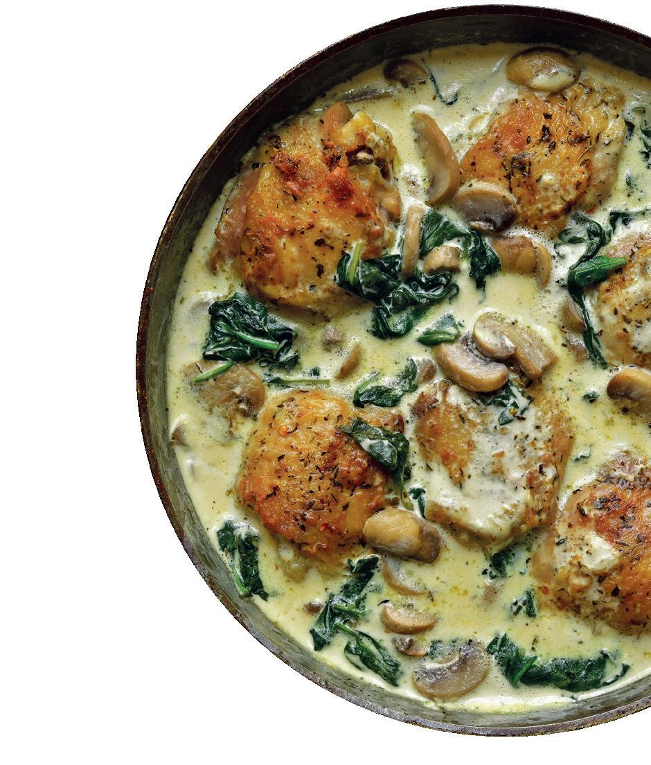 1 Preheat your oven to 180°C/160°C fan/gas mark 5. Season the chicken, fry in a little oil in an ovenproof casserole dish for 3 mins until slightly brown and sealed, then remove from the pan. 2 Fry the onion and garlic in the same pan for 5 mins until softened, then add the mushrooms for a further 5 mins (add a splash of water if the pan gets dry). Season and add the herbs, then pour in the wine and chicken stock, and return the chicken to the pan. Bring to a simmer, then cover and roast in the oven for 30 mins (uncover for the final 10 mins and add the spinach if using). Remove from the oven and stir in the Greek yogurt. Simmer for a few mins if the sauce needs to reduce a little, then serve in bowls.