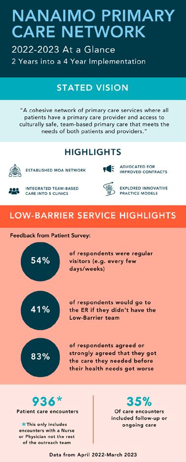 Despite the onslaught of several health care crises — the toxic drug supply epidemic, the continuing blight of the pandemic, HHR shortages, and funding challenges — the Division has been able to celebrate new successes. Our funding has supported a unique Shared Care project creating a centralized referral system for paediatrics in Nanaimo. This project, in a first for Divisions, received funding from the Specialised Services Committee and the Shared Care Committee to support a truly shared care Initiative.