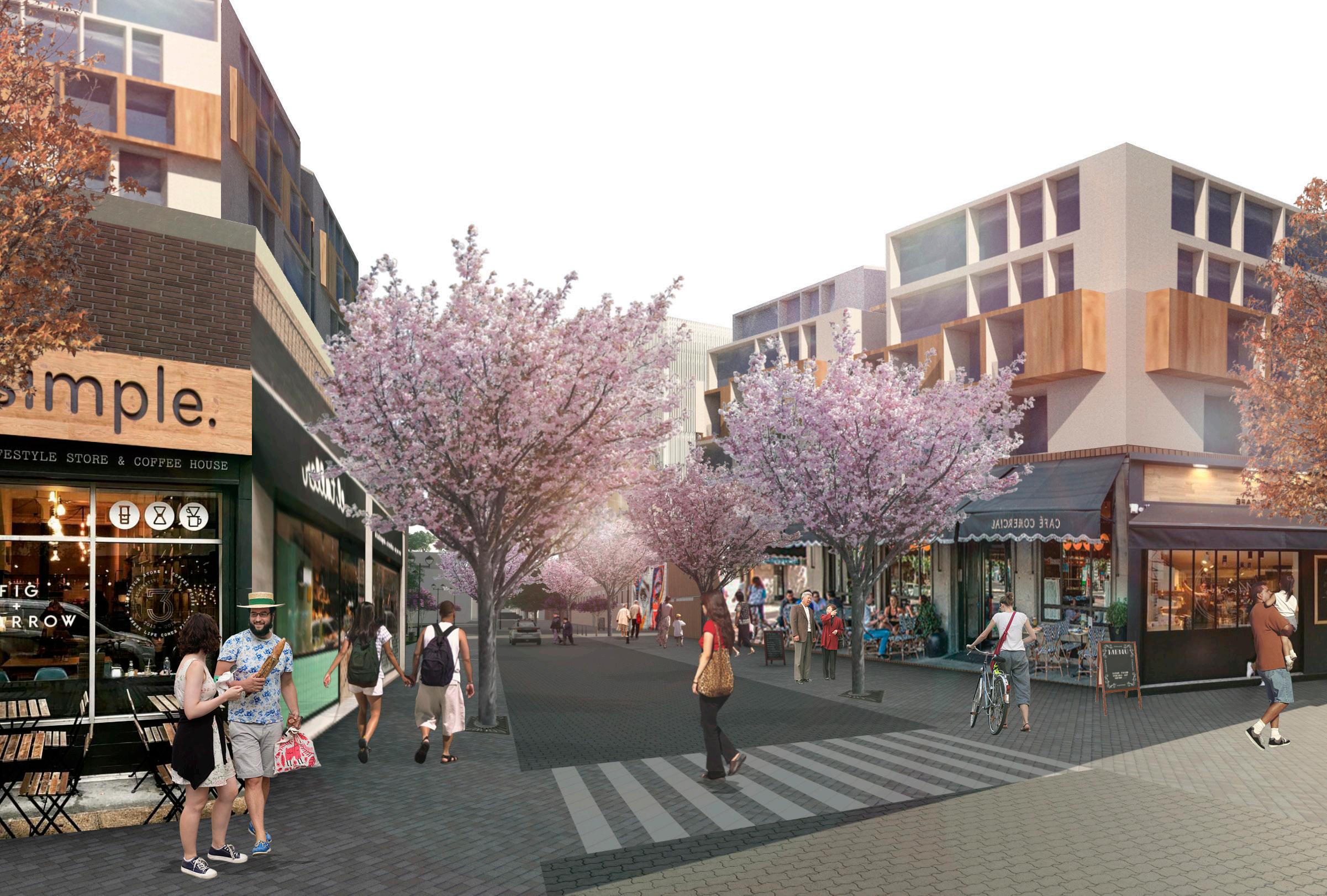 • Key central street lined with cherry blossom trees as iconic feature