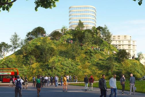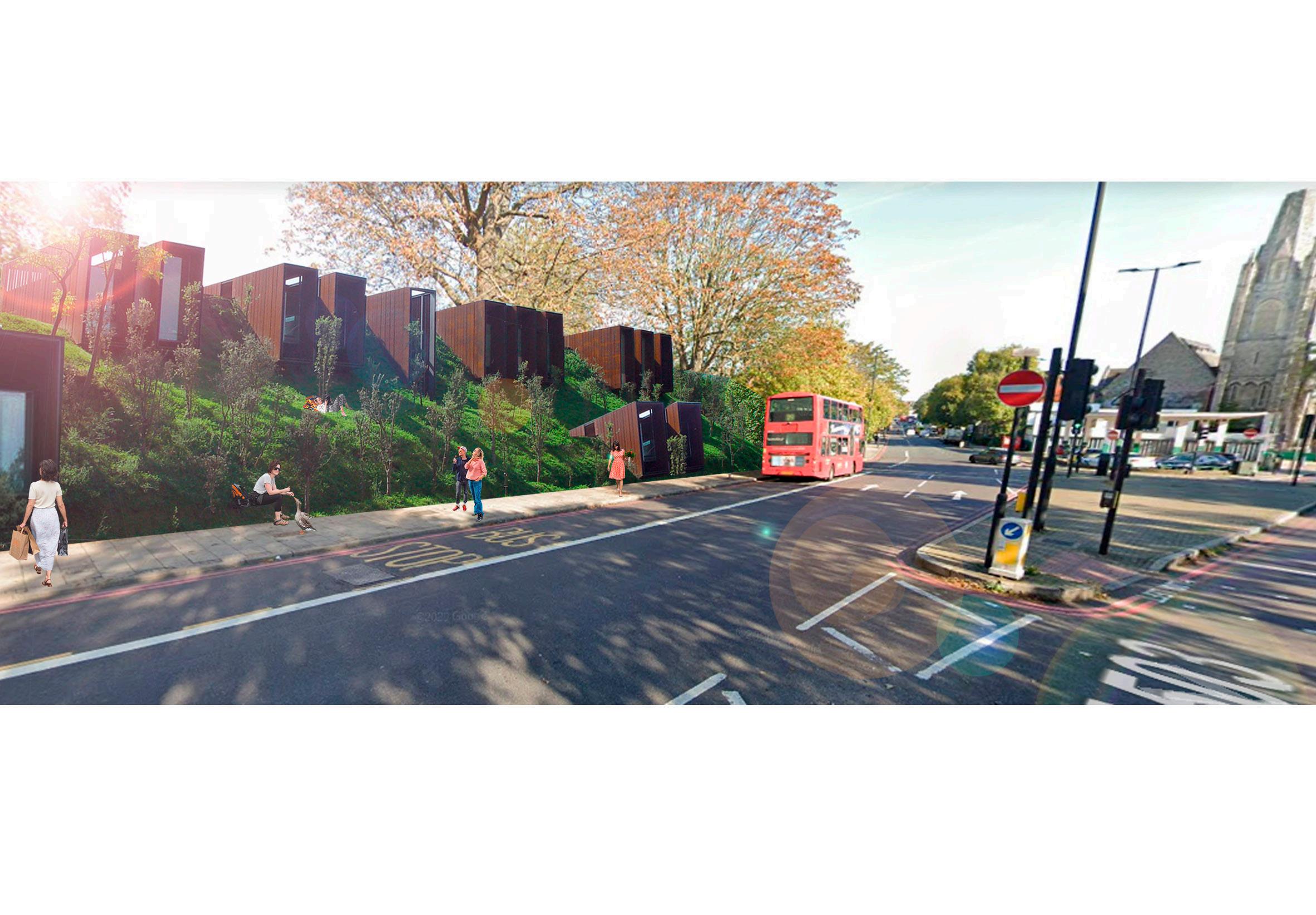 The Hill helps to tackle noise and air pollution by creating a barrier between Camden Road and the site. Mixed uses support the local economy and create an active street front. 843 residential units can be provided through this design and the public space accomodates both green space and retail space in a relatively small surface area. The scheme is low to mid rise which helps to provide a human-scale.