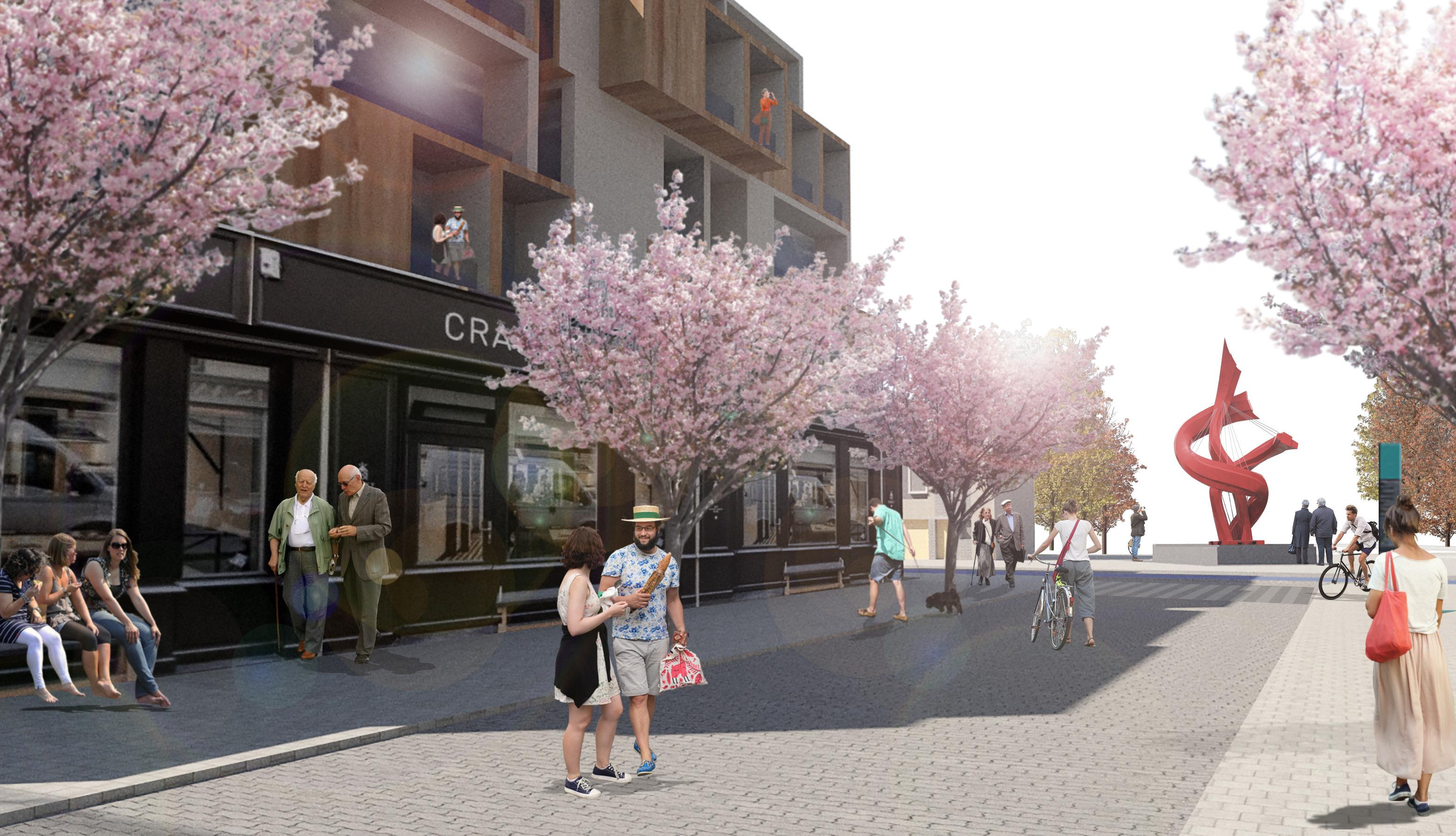CENTRAL STREET LEADING TO THE WOMEN’S STATUE. LINED WITH BLOSSOM TREES AS A CENTRAL FEATURE OF THE DEVELOPMENT.
