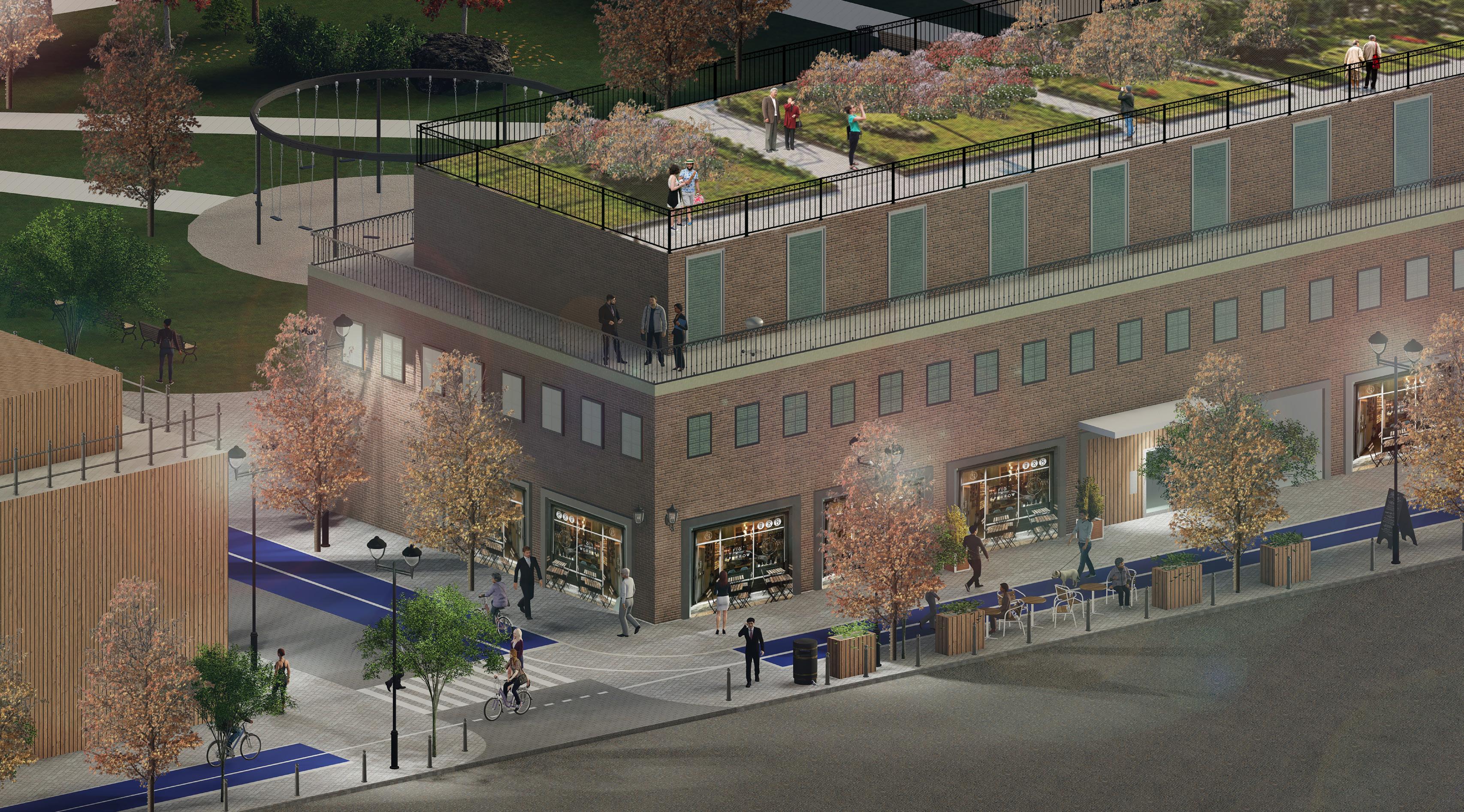PUBLIC SPACE AMENITIES INCLUDING COURTS, OUTDOOR GYM & CHILDREN’S PARK GROUND FLOOR TO INCLUDE SHOPS, FOOD AND DRINK. UPPER FLOORS FOR RESIDENTIAL.