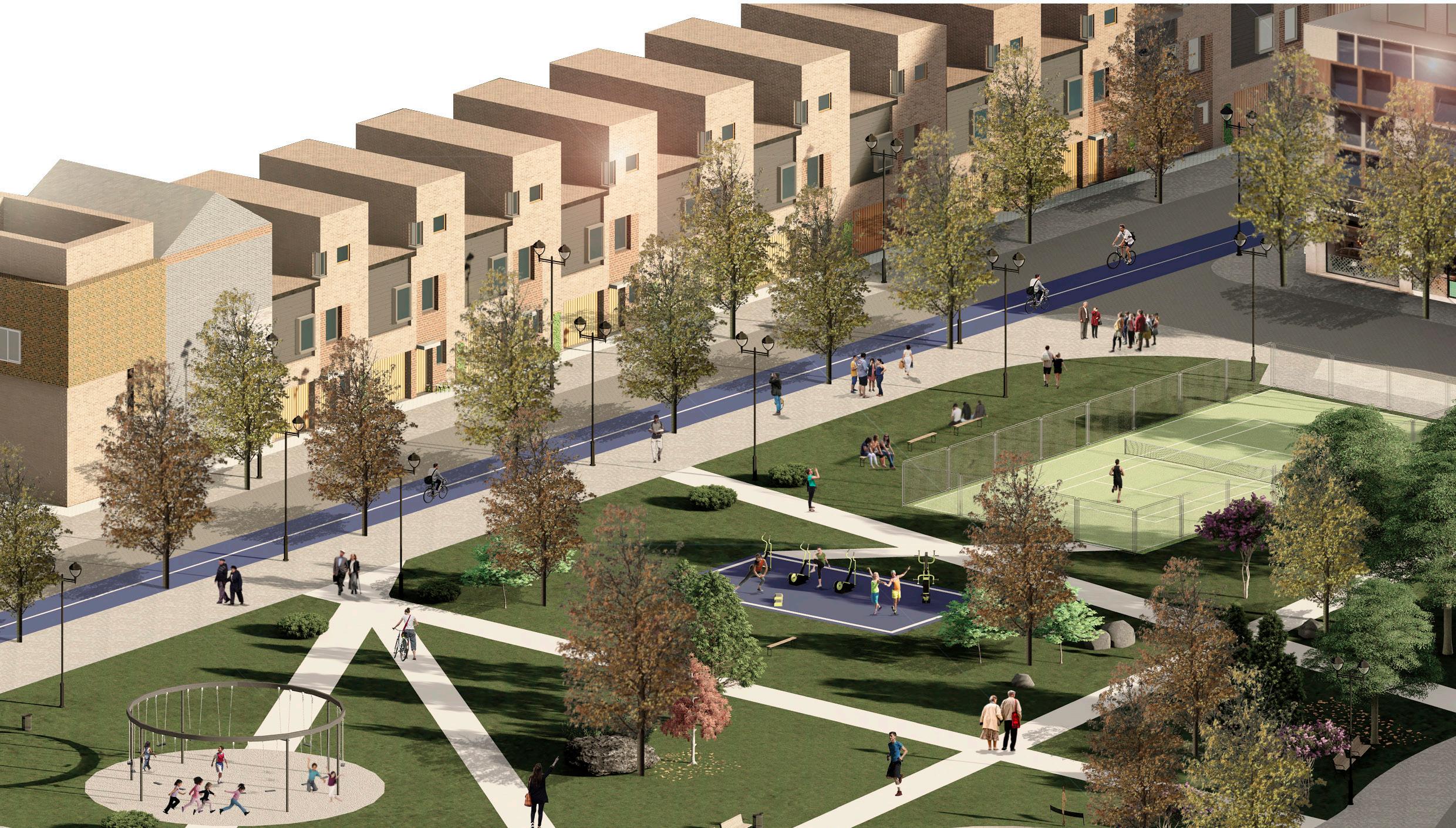 Creation of roads, cycle lanes and pedestrian walkways opens the site up to the public. Providing attractive public spaces alongside mixed amenities and high quality housing will bring people to the area.