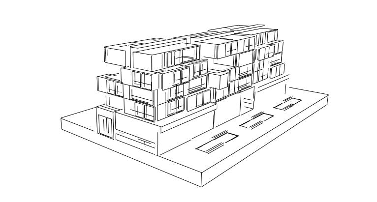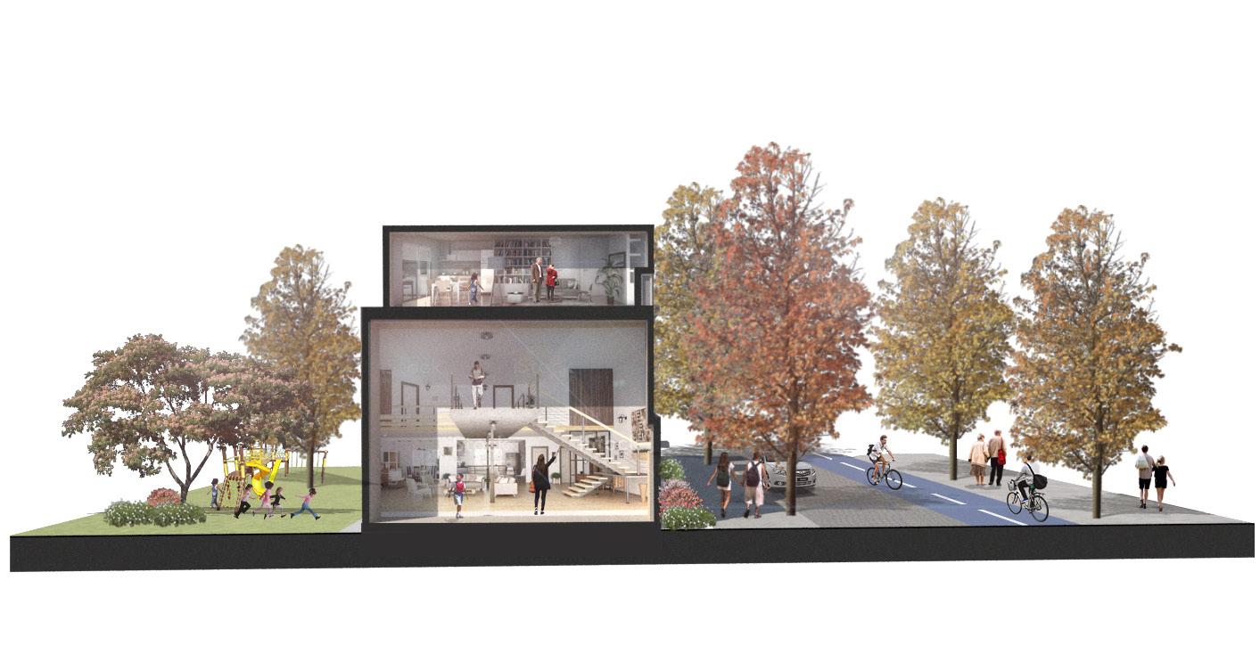 • Private entrances on the street, creating an active private-public interface