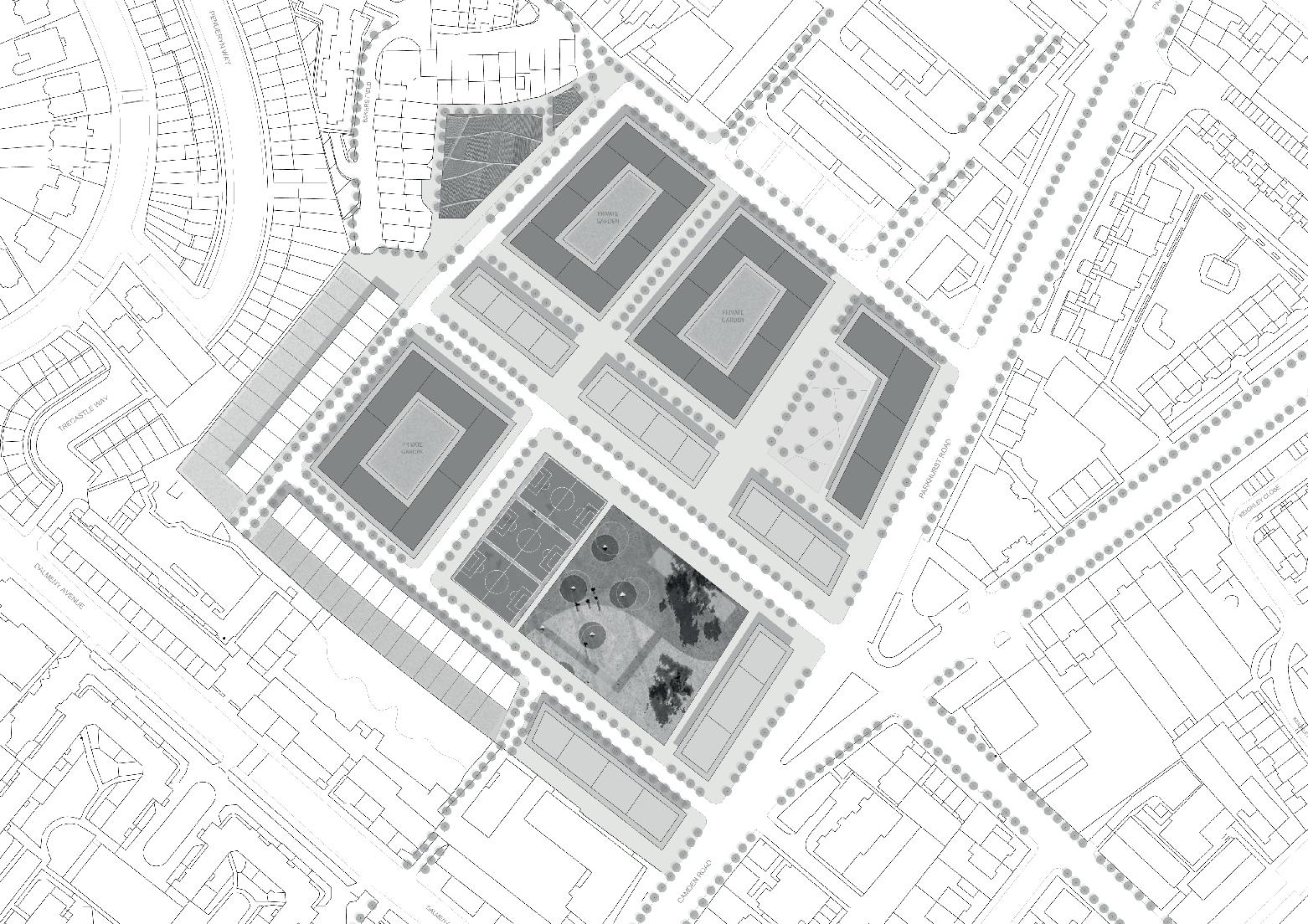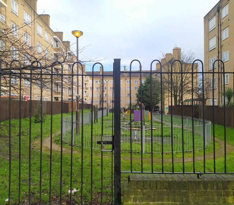 Extensive semi-private green spaces are a common feature surrounding the residential estates. As an illustrative example, in Lower Hilldrop Estate green space has public access, its character, however, feels like private. It is fenced and structured around corridors and accesses, and it includes some playground areas. Additionally, there are restrictions on the use of space e.g. ‘no ball games’, which make those spaces less attractive. These analysis indicates that semi-private green spaces are the desirable practice for the new neighbourhood, where a clear distinction between public and private green space will potentially be adopted.